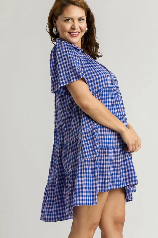 Umgee Full Size Gingham Tiered Button Detail Short Sleeve Dress Plus Size